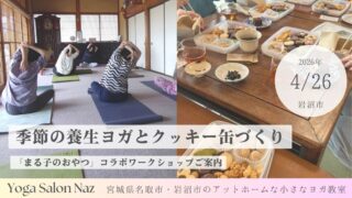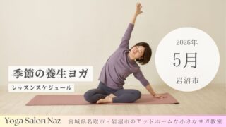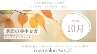Yoga Salon Naz(ヨガ サロン ナーズ)は、宮城県名取市、岩沼市の30代、40代以降も体も心も若々しく!わたしらしく人生を楽しみたい女性のためのアットホームな小さなヨガ教室です。